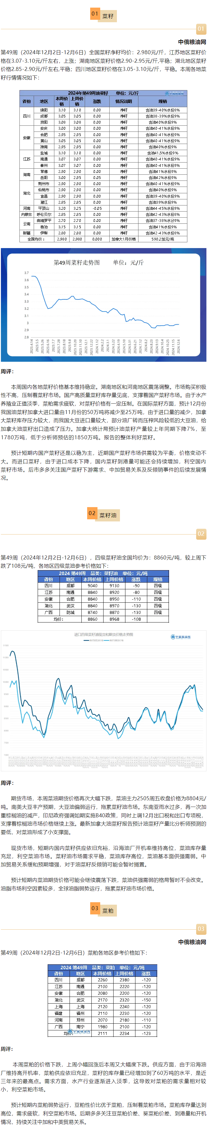 国内菜籽、菜籽油、菜粕┃一周交易综述及分析预测(2024年第49周)